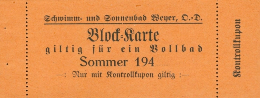 Tickets Schwimm- und Sonnenbad Weyer, O.-Ö. Block-Karte giltig für ein Vollbad Sommer 194_ —: Nur mit Kontrollkupon giltig :— Die Eintrittskarten, die