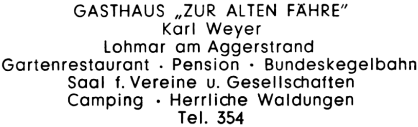 GASTHAUS "ZUR ALTEN FÄHRE" Karl Weyer Lohmar am Aggerstrand Gartenrestaurant · Pension · Bundeskegelbahn Saal f. Vereine u. Gesellschaften Camping · Herrliche Waldungen Tel. 354