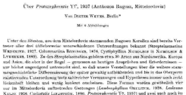 Paläontologische Abhandlungen · Abt. A · Paläozoologie · Bd. IV, Heft 4 · 695–706 · Berlin März 1973 Über Protozaphrentis YÜ, 1957 (Anthozoa Rugosa, Mittelordoviz) Von DIETER WEYER, Berlin* Mit 6 Abbildungen siehe auch: |